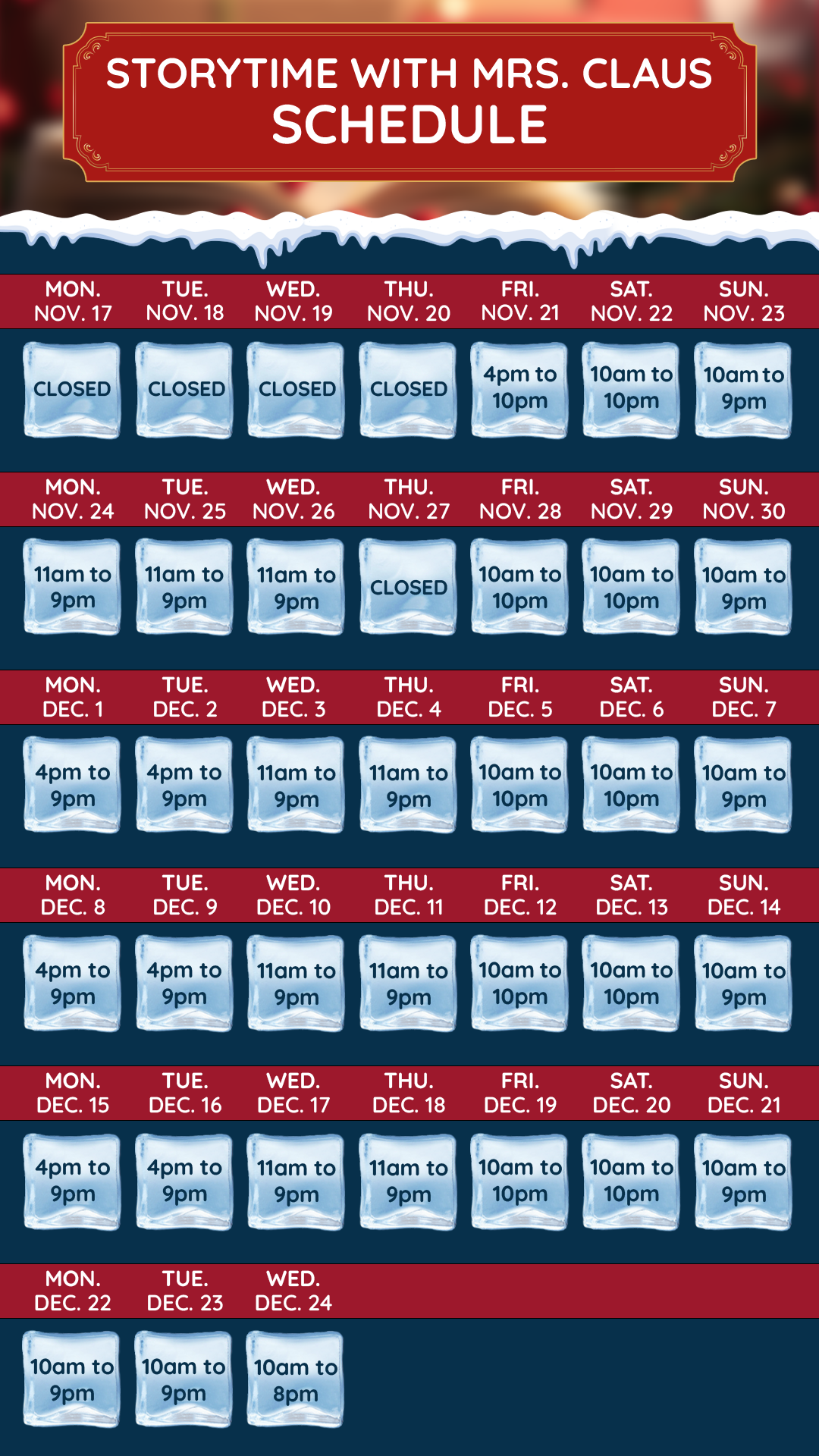 Storytime with Mrs. Claus starts one hour after Snowcat Ridge opens until one hour before Snowcat Ridge closes. See Mrs. Claus’ complete schedule here.